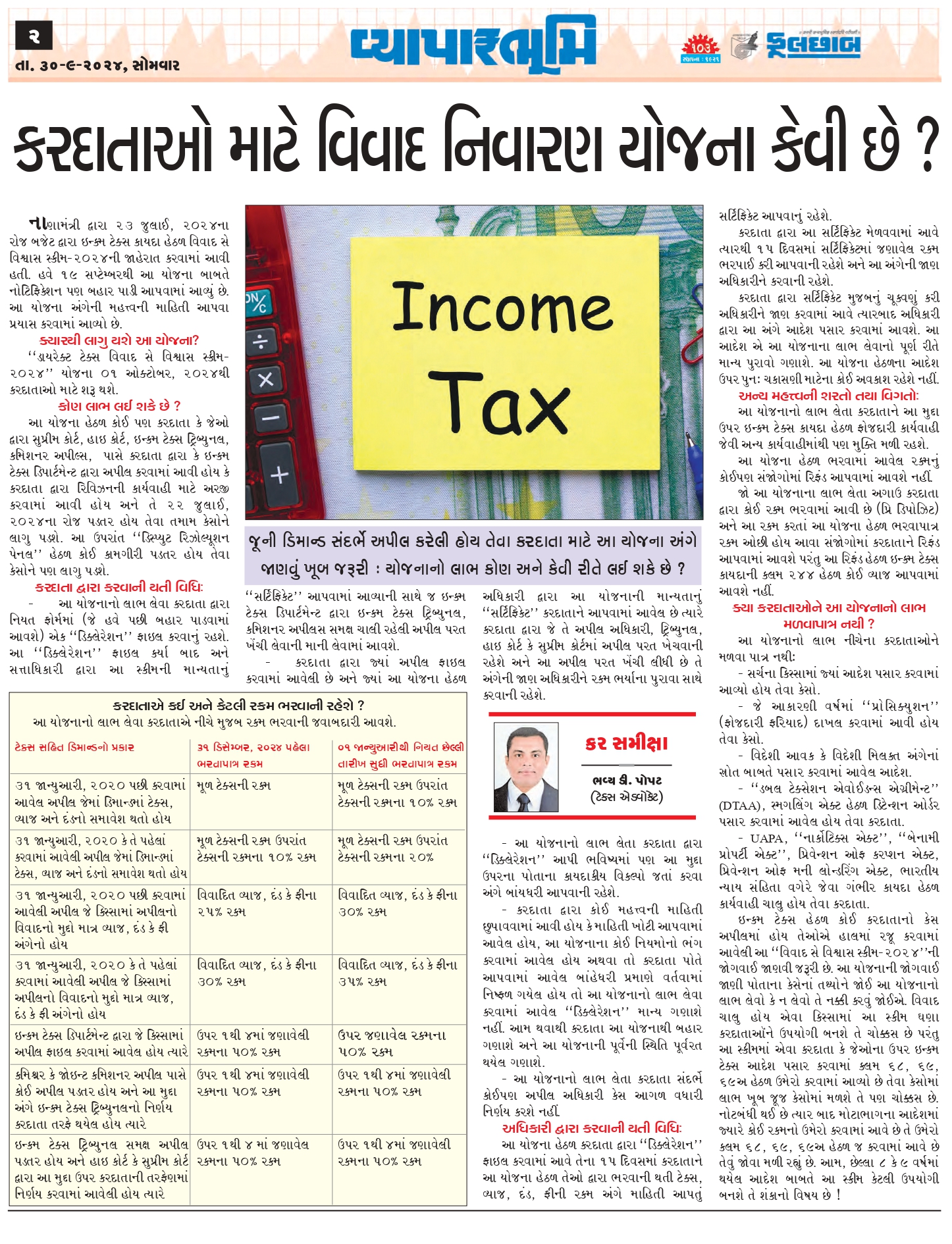 નાણામંત્રી દ્વારા 23 જુલાઇ 2024 ના રોજ બજેટ દ્વારા ઇન્કમ ટેક્સ કાયદા હેઠળ “વિવાદ સે વિશ્વાસ સ્કીમ-2024” ની જાહેરાત કરવામાં આવી હતી. હવે 19 સપ્ટેમ્બરથી આ યોજના બાબતે નોટિફિકેશન પણ બહાર પાડી આપવામાં આવ્યું છે. આ યોજના અંગેની મહત્વની માહિતી આ લેખમાં આપવા પ્રયાસ કરવામાં આવ્યો છે.