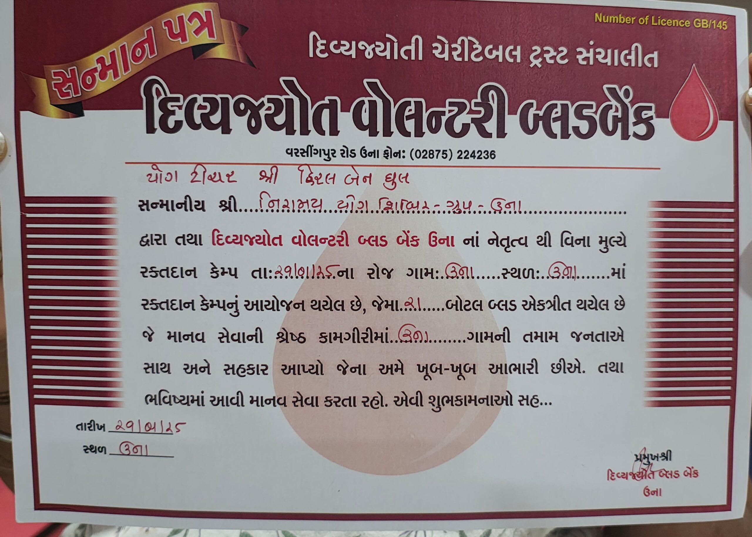 મહિલા ગ્રૂપના યોગ શિક્ષક હિરલબેન ઘૂલ તથા જીવન જ્યોત બ્લડ બેન્કના સહયોગથી થયું આયોજન