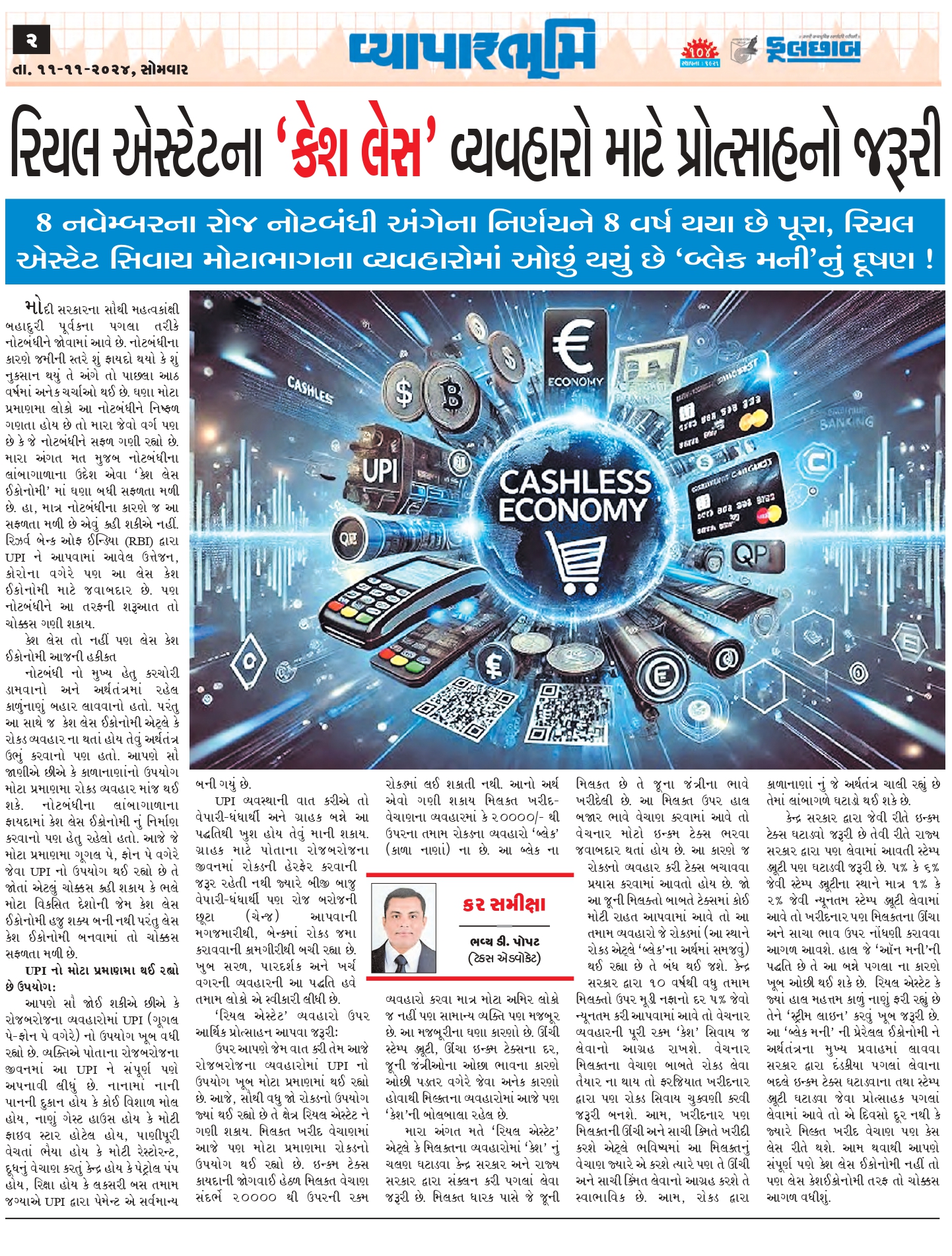 ઉપર આપણે જેમ વાત કરી તેમ આજે રોજબરોજના વ્યવહારોમાં UPI નો ઉપયોગ ખૂબ મોટા પ્રમાણમાં થઈ રહ્યો છે. આજે, સૌથી વધુ જો રોકડનો ઉપયોગ જ્યાં થઈ રહ્યો છે તે ક્ષેત્ર “રિયલ એસ્ટેટ” ને ગણી શકાય. મિલ્કત ખરીદ વેચાણમાં આજે પણ મોટા પ્રમાણમા રોકડનો ઉપયોગ થઈ રહ્યો છે. ઇન્કમ ટેક્સ કાયદાની જોગવાઈ હેઠળ મિલ્કત વેચાણ સંદર્ભે 20000 થી ઉપરની રકમ રોકડમાં લઈ શકાતી નથી. આનો અર્થ એવો ગણી શકાય મિલ્કત ખરીદ-વેચાણ ના વ્યવહારમાં કે 20000/- થી ઉપરના તમામ રોકડના વ્યવહારો “બ્લેક” (કાળા નાણાં) ના છે. આ “બ્લેક” ના વ્યવહારો કરવા માત્ર મોટા અમિર લોકો જ નહીં પણ સામાન્ય વ્યક્તિ પણ મજબૂર છે. આ મજબૂરીના ઘણા કારણો છે. ઊંચી સ્ટેમ્પ ડ્યૂટી, ઊંચા ઇન્કમ ટેક્સના દર, જૂની જંત્રીઓના ઓછા ભાવના કારણે ઓછી પડતર વગેરે જેવા અનેક કારણો હોવાથી મિલ્કતના વ્યવહારોમાં આજે પણ “કેશ” ની બોલબાલા રહેલ છે.