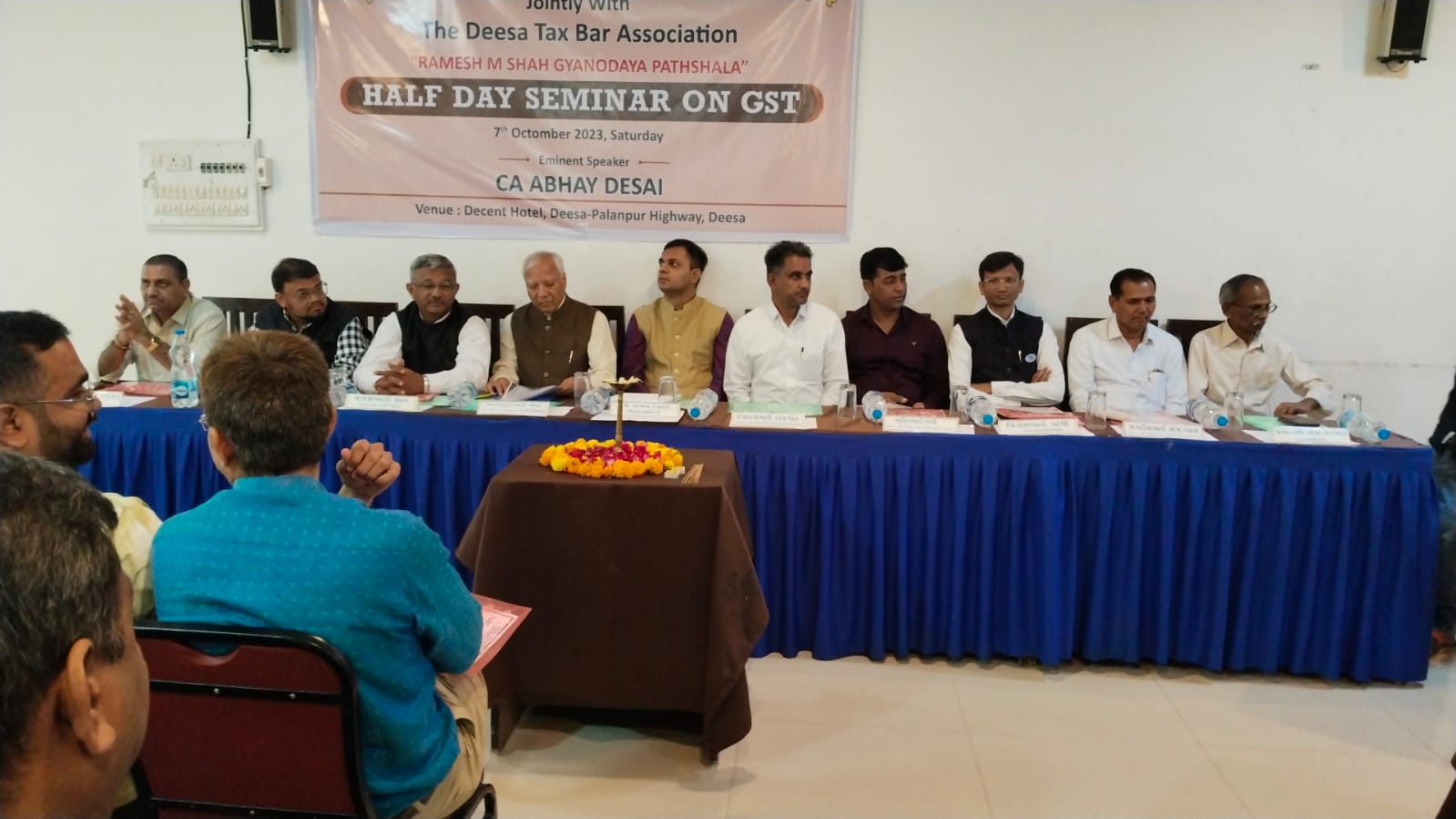 તા. 09.10.2023: તા.07/10/2023 ને શનિવારના રોજ ડીસા ખાતે GSTBA અને ડીસા ટેક્ષ બાર એસોસિએશનના સંયુક્ત ઉપક્રમે આર. એમ.શાહ પાઠશાળા નું સુંદર આયોજન કરવામાં આવેલું જેમાં ”C. A.અભય દેસાઈ – બરોડા દ્વારા સુંદર અને અસરકારક વકતવ્ય આપી સૌને ખુબજ ઉપયોગી માર્ગદર્શન આપવામાં આવેલ હતું. આ સેમિનાર માં સમગ્ર ઉત્તર ગુજરાત માંથી ખુબજ મોટાપાયે વકિલો તથા ટેક્સ પ્રોફેશનલ્સ હાજર રહેલ હતા તેમજ સુરત,બરોડા તથા અમદાવાદથી પણ વકીલો તથા ટેક્સ પ્રોફેશનલ્સ હજાર રહેલ હતા. GSTBA ના પ્રમુખ,સેક્રેટરી બંને કન્વીનર તથા ડીસા ટેક્ષ બાર ના પ્રમુખ, સેક્રેટરી તથા બનાસકાંઠા બાર ના પ્રમુખ,સેક્રેટરી હાજર રહેલ. સમગ્ર કાર્યક્રમ નું સંચાલન ડીસા ના સીનીયર એડવોકેટ તથા ડીસા બાર તથા બનાસકાંઠા અને ઉત્તર ગુજરાત બાર ના ભૂતપૂર્વ પ્રમુખ શાંતીલાલ સી. ઠક્કરે કરેલ હતું. CA અભયભાઈ દેસાઈ દ્વારા સૌને ખુબજ રસપ્રદ અને ઉપયોગી માર્ગદર્શન આપવામાં આવ્યું હતુ. બ્યૂરો રિપોર્ટ, ટેક્સ ટુડે