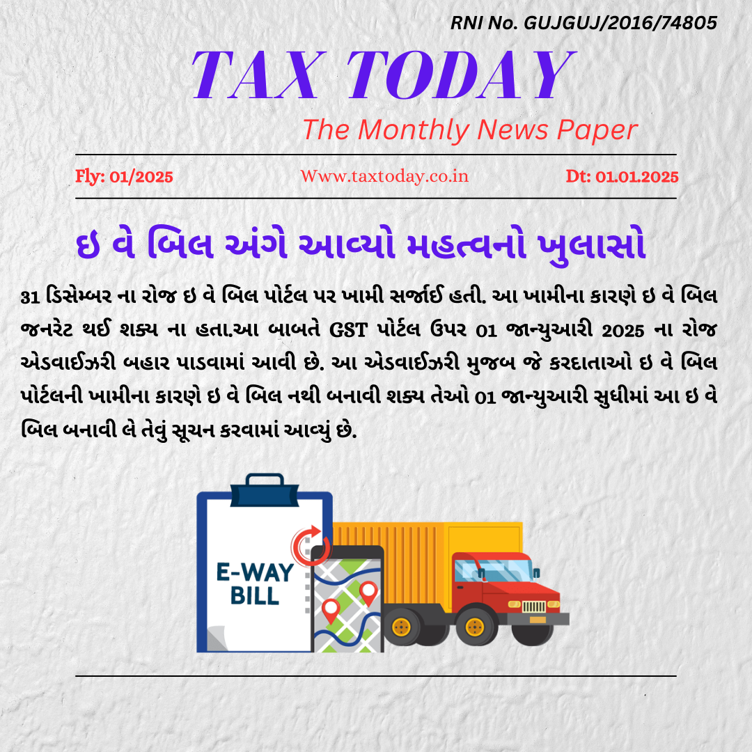 Top News ઇ વે બિલ અંગે બહાર પાડવામાં આવી મહત્વની એડવાઈઝરી Bhavya Popat January 1, 2025 Spread the loveReading Time: < 1 minute Continue Reading Previous ઇન્કમ ટેક્સ રિટર્ન ભરવાની મુદત 31 ડિસેમ્બર 2024 થી 15 જાન્યુઆરી સુધી વધારવામાં આવીNext Tax Today E Edition December 2024 More Stories Top News તમાકુ ઉત્પાદનોમાં RSP આધારિત GST: વેપારીઓ માટે રીટર્ન ભરવામાં અનેક મુશ્કેલીઓ Guest Writer (Article from Expert) April 13, 2026 0 Top News GST WEEKLY UPDATE :2/2026-27 (12.04.2026) By CA Vipul Khandhar Guest Writer (Article from Expert) April 13, 2026 0 Top News Financial year just ended!! Do follow this financial Check List by Adv. Ronak Jain Guest Writer (Article from Expert) April 8, 2026 0