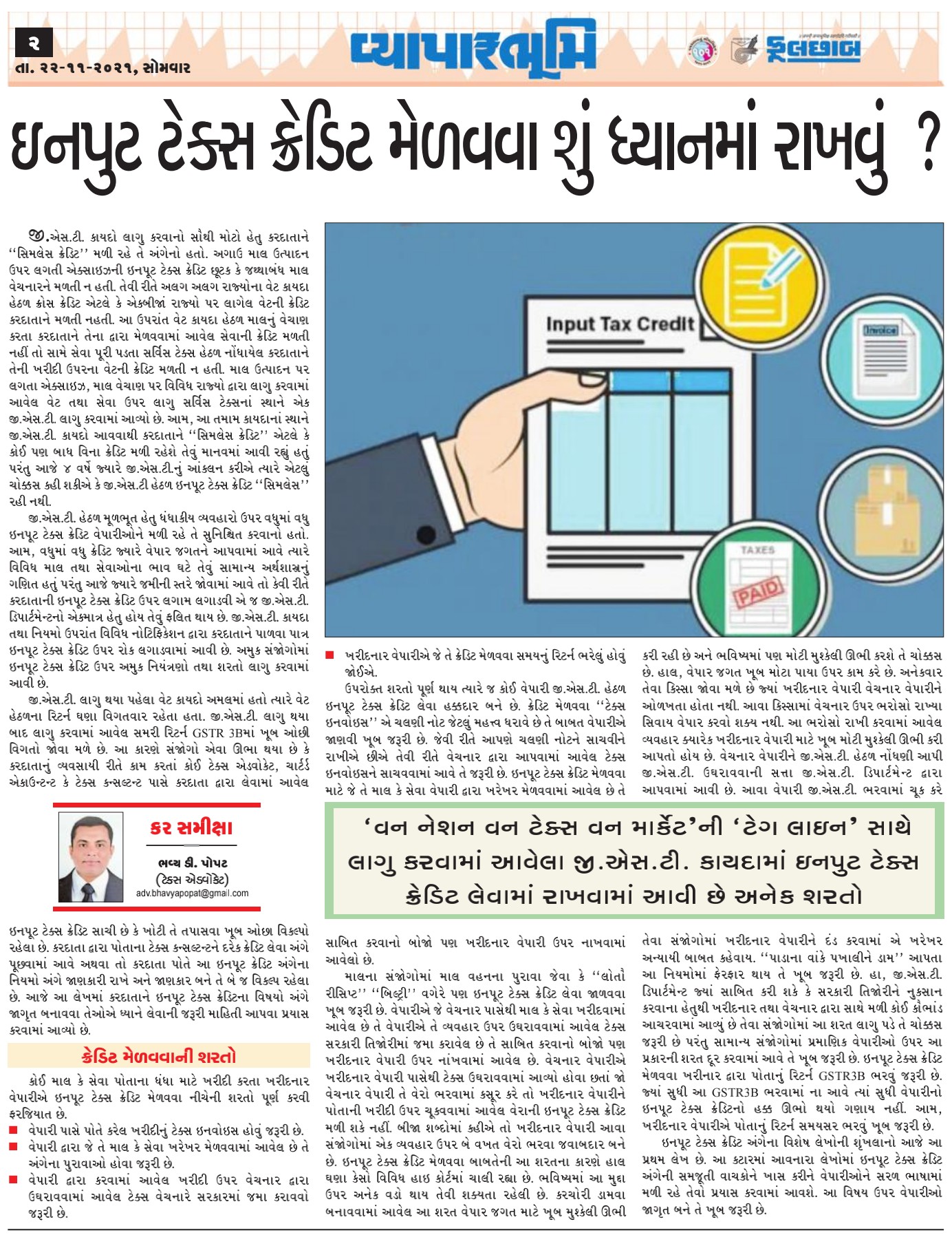 ઈન્પુટ ટેક્સ ક્રેડિટ અંગેના વિશેષ લેખોની શ્રુંખલાનો આજે આ પ્રથમ લેખ છે. આ કટારમાં આવનારા લેખોમાં ઈન્પુટ ટેક્સ ક્રેડિટ અંગેની સમજૂતી વાચકોને ખાસ કરીને વેપારીઓને સરળ ભાષામાં મળી રહે તેવો પ્રયાસ કરવામાં આવશે. આ વિષય ઉપર વેપારીઓ જાગૃત બને તે ખૂબ જરૂરી છે.