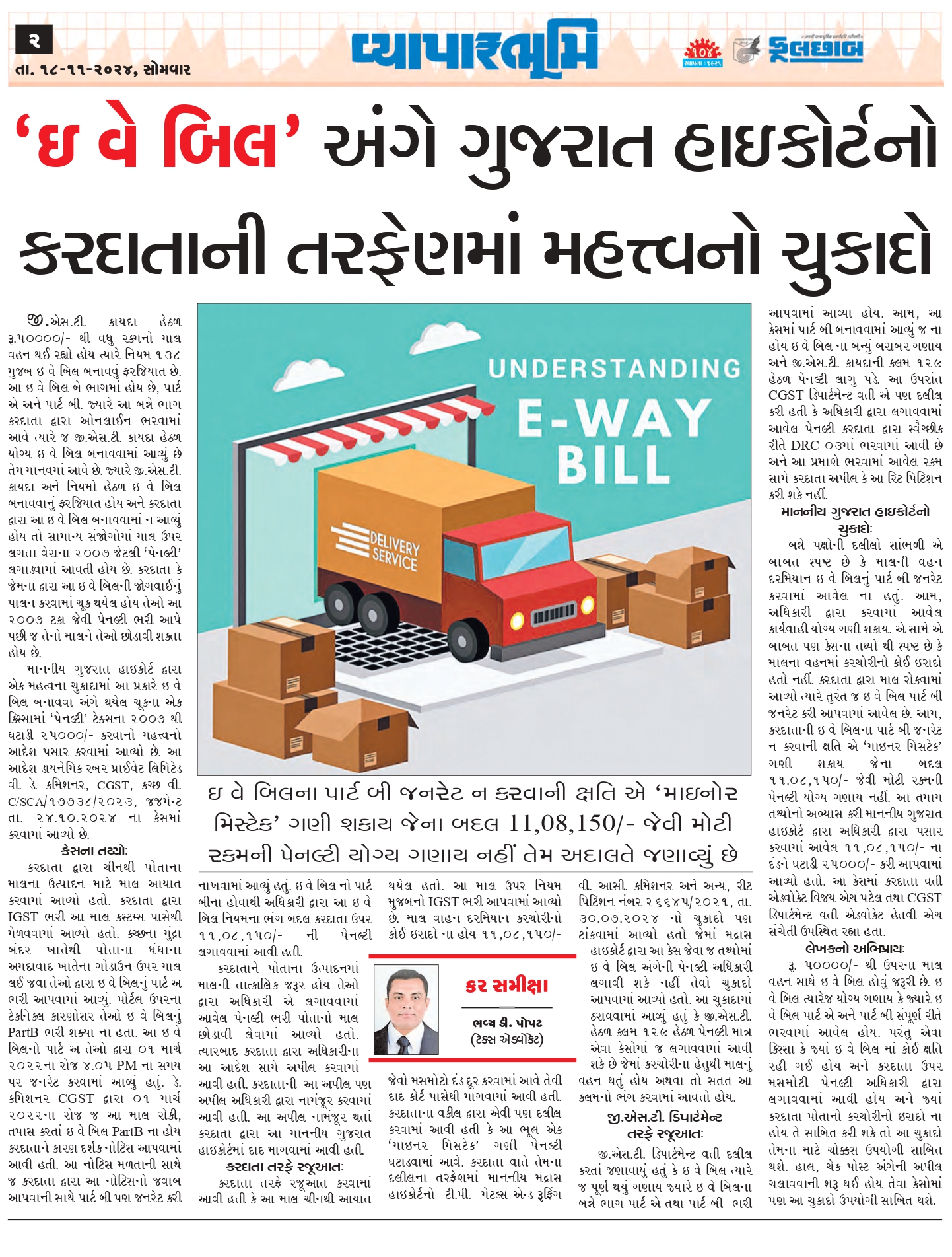 50000/- થી ઉપરના માલ વહન સાથે ઇ વે બિલ હોવું જરૂરી છે. ઇ વે બિલ ત્યારે જ યોગ્ય ગણાય કે જ્યારે ઇ વે બિલ Part A અને Part B સંપૂર્ણ રીતે ભરવામાં આવેલ હોય. પરંતુ એવા કિસ્સા કે જ્યાં ઇ વે બિલ માં કોઈ ક્ષતિ રહી ગઈ હોય અને કરદાતા ઉપર મસમોટી પેનલ્ટી અધિકારી દ્વારા લગાવવામાં આવી હોય અને જ્યાં કરદાતા પોતાનો કરચોરીનો ઇરાદો ના હોય તે સાબિત કરી શકે તો આ ચુકાદો તેમના માટે ચોક્કસ ઉપયોગી સાબિત થશે. હાલ, ચેક પોસ્ટ અંગેની અપીલ ચલાવવાની શરૂ થઈ હોય તેવા કેસોમાં પણ આ ચુકાદો ઉપયોગી સાબિત થશે. ઉલ્લેખનીય છે કે આ ચુકાદામાં કરદાતા વતી હાજર થયેલ એડવોકેટ રાહીલભાઈ પ્રદીપભાઇ જૈન, એ ગુજરાત સ્ટેટ ટેક્સ બાર એસો. ના સિનિયર સભ્ય પ્રદીપભાઇ જૈનના પુત્ર છે.
