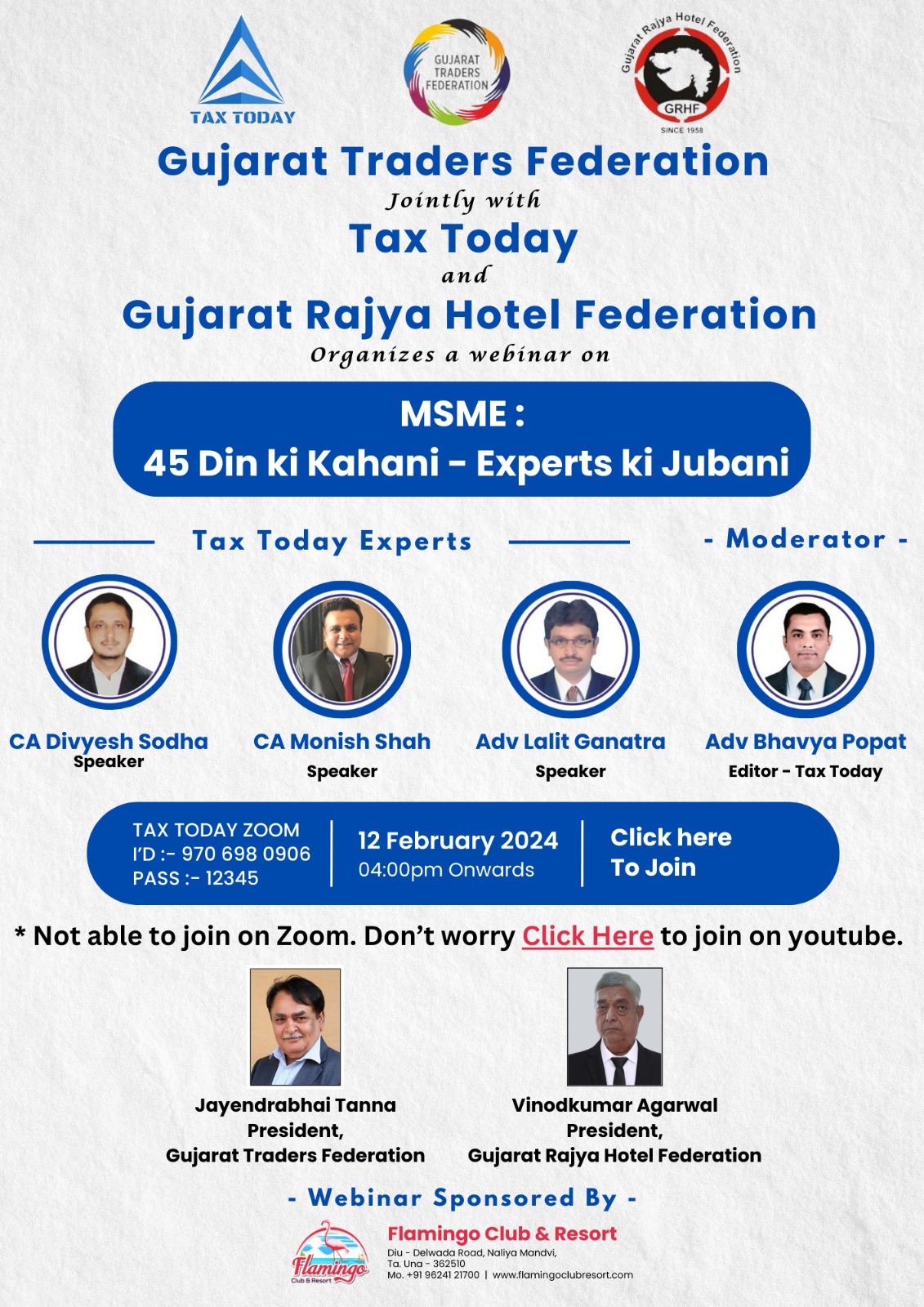 Top News MSME Webinar Today @ 4 PM [Seminar on new provisions of 43B(h)] Bhavya Popat February 12, 2024 Spread the loveReading Time: < 1 minute Continue Reading Previous સવાલ આપના જવાબ ટેક્સ ટુડે એક્સપર્ટના (આ કૉલમ દર શનિવારે પ્રસિદ્ધ થશે) Dt : 10.02.2024Next GST WEEKLY UPDATE : 46/2023-24 (11.02.2024) By CA Vipul Khandhat More Stories Top News ગુજરાત હાઈકોર્ટનો મહત્વપૂર્ણ ચુકાદો: ટ્રાન્ઝિટ દરમિયાન GST હેઠળ માલ જપ્તી અંગે કડક માપદંડ નક્કી Guest Writer (Article from Expert) January 6, 2026 0 Top News GST WEEKLY UPDATE :40/2025-26 (04.01.2026) Guest Writer (Article from Expert) January 5, 2026 0 Top News ભાગીદારી પેઢીઓ માટે મહત્વનો ફેરફાર: ભાગીદારોને થતી ચુકવણી પર TDS ફરજિયાત Guest Writer (Article from Expert) January 5, 2026 0