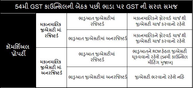 જીએસટી કાયદો આવ્યો છે ત્યારથી જીએસટીમાં નોંધાયેલ કરદાતા તેની કૉમર્શિઅલ પ્રોપર્ટી ભાડે આપે તો તેવા કિસ્સામાં જીએસટી ભરવાની જવાબદારી મકાનમાલિકની રહેતી હતી. પણ હાલ જો કરદાતા જીએસટીમાં નોંધાયેલ ના હોય તો તેવા કિસ્સામાં જીએસટી લાગતો ના હતો. ૫૪મી જી.એસ.ટી. કાઉન્સિલની મિટિંગમાં લેવામાં આવેલા નિર્ણયથી જો મકાનમાલિક જીએસટીમાં નોંધાયેલ ના હોય અને તે તેની કૉમર્શિઅલ પ્રોપર્ટી જીએસટી કાયદામાં નોંધાયેલ કરદાતાને ભાડે આપે તો ભાડુઆતે રિવર્સ ચાર્જ મિકેનિઝમ હેઠળ જીએસટી ભરવાનો રહેશે.આ નાના પણ અતિ મહત્વના ફેરફારના કારણે રિવર્સ ચાર્જ હેઠળ, જીએસટી ચૂકવવાની જવાબદારી હવે મકાનમાલિક પાસેથી,ભાડે લેનાર ભાડુઆત પર લાગુ થશે. મોટા ભાગના કિસ્સામાં નાના વેપારીઓ ધંધો કરવા ધંધાની જગ્યા ભાડે લેતા હોય છે અને ભાડે આપનાર મકાન માલિક જીએસટી કાયદા માં નોંધાયેલ હોતા નથી. આ ફેરફારથી કરદાતાઓ ને ૧૮% ટેક્સ રિવર્સ ચાર્જ મિકેનિઝમથી ભરવાનો રહેશે. જો કરદાતાને તેટલી રકમના ટેકસની લાયબીલીટી ન આવે તો વધારાની રકમ દર મહિને ક્રેડિટ લેઝરમાં જમાં પડી રહેશે. બીજી તરફ વેપારીને દર મહિને ભાડાના 18 ટકાની રકમનો બોજો ઉમેરાતો જશે.