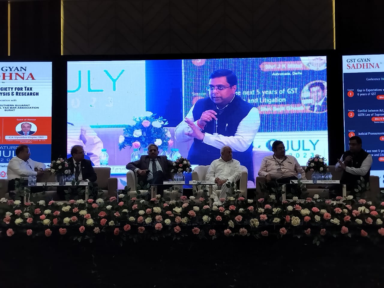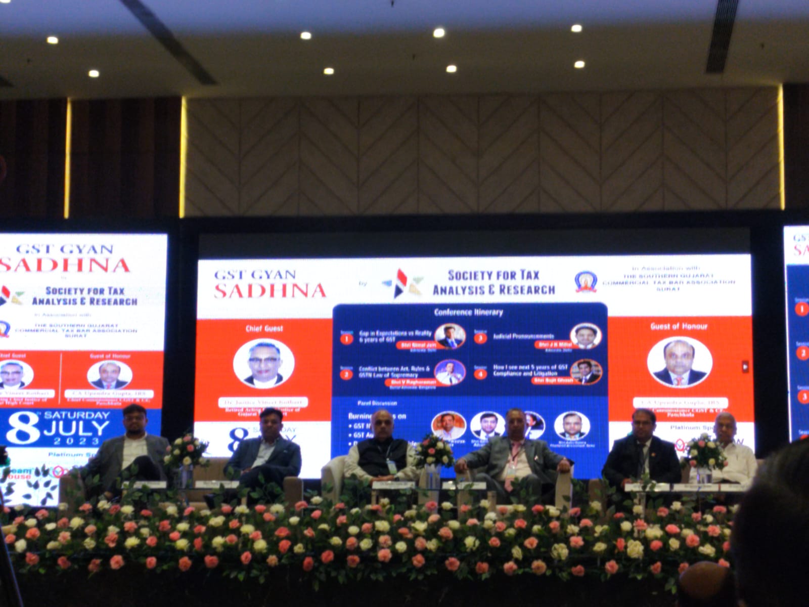 તા. 08.07.2023: ટેક્સેશન ક્ષેત્રે જાણીતી સંસ્થા STAR (SOCIETY FOR TAX ANALYSIS & RESEARCH) તથા સુરત ખાતેના જી.એસ.ટી. પ્રેકટિશનર્સના એસોસીએશન ધ સધર્ન ગુજરાત કોમર્શિયલ ટેક્સ બાર એસોસીએશન ના સહયોગથી સુરત ખાતે તા.૦૮ જુલાઈ, ૨૦૨૩ ના રોજ જી.એસ.ટી. ના વિવિધ વિષયો ઉપર જ્ઞાન સાધના નામથી એક સેમિનારનું આયોજન કરવામાં આવ્યું હતું. આ એક દિવાસીય GST સેમિનારમાં જીએસટી ના વિવિધ વિષયો ઉપર દેશભરમાં જાણીતા GST વિશેષજ્ઞ દ્વારા ઉપસ્થિત સભ્યો સાથે જ્ઞાનની આપ લે કરવામાં આવી હતી. આ સંમેલનમાં મુખ્ય અતિથિ તરીકે ગુજરાત હાઈકોર્ટના ભૂતપૂર્વ કાર્યકારી મુખ્ય ન્યાયાધીશ અને સુપ્રીમ કોર્ટના વરિષ્ઠ વકીલ ડો. વિનીત કોઠારી અને CGST ચિફ કમિશ્નર CA. ઉપેન્દ્ર ગુપ્તા ખાસ હાજર રહ્યા હતા. આ સંમેલનમાં વિવિધ જીએસટી વિશેષજ્ઞ દિલ્હીના એડવોકેટ તથા CA બિમલ જૈન, બેંગલુરુના વરિષ્ઠ એડવોકેટ વી.રઘુરમન, દિલ્હીના એડવોકેટ જે. કે. મિત્તલ અને દિલ્હીના એડવોકેટ સુજીત ઘોષ દ્વારા જીએસટી ના વિવિઘ મુદ્દાઓ પર સંમેલન માં હાજર રહેલા ટેક્સ પ્રેક્ટિશનરોને જ્ઞાન આપવામાં આવ્યું. આ સંમેલન ના અંતિમ સેશનમાં પેનલ ડીશકસનનું આયોજન કરાયું જેમાં ગાઈડ તરીકે એડવોકેટ ડો. અવિનાશ પોદાર, CA. આલોક ફરસૈય, એડવોકેટ ડો. ગૌરવ ગુપ્તા અને CA. આશુ દાલમિયાએ સેવા આપી હતી. આ પેનલ ડીસકશનમાં ઉપસ્થિત સભ્યોના પ્રશ્નોના જવાબ પણ આપવામાં આવ્યા હતા. આ સંમેલનમાં આશરે ૧૦૦ થી વધુ ટેક્સ પ્રેક્ટિશનરો હાજર રહ્યા હતા. કાર્યેક્રમને સફળ બનાવવા જાણીતા એડવોકેટ ડો. અવિનાશ પોદ્દારના તથા તમામ સ્ટાફ ગણે મહેનત ઉઠાવી હતી. રોનક પલાણ તથા ભાર્ગવ ગણાત્રા, ટેક્સ ટુડે