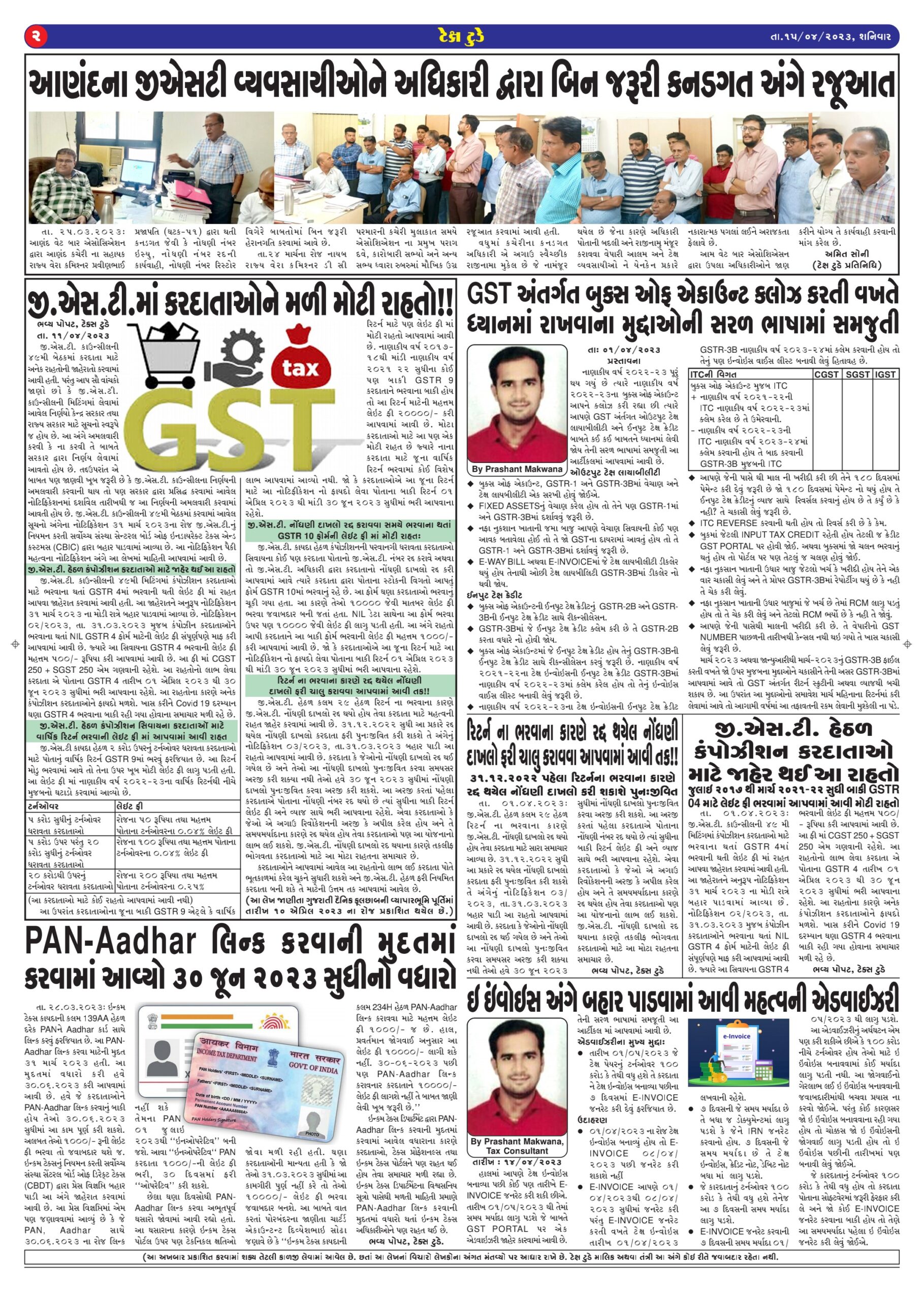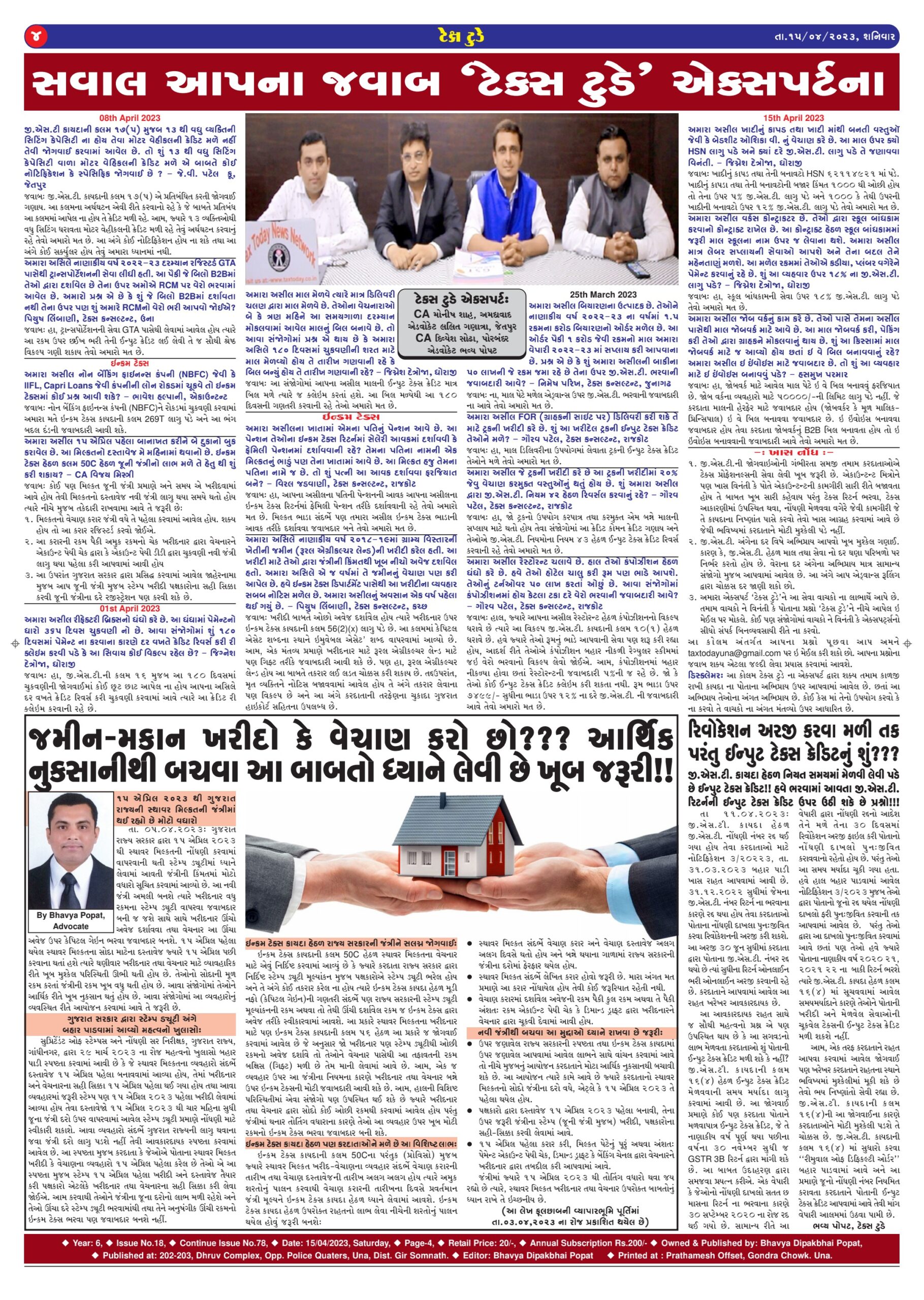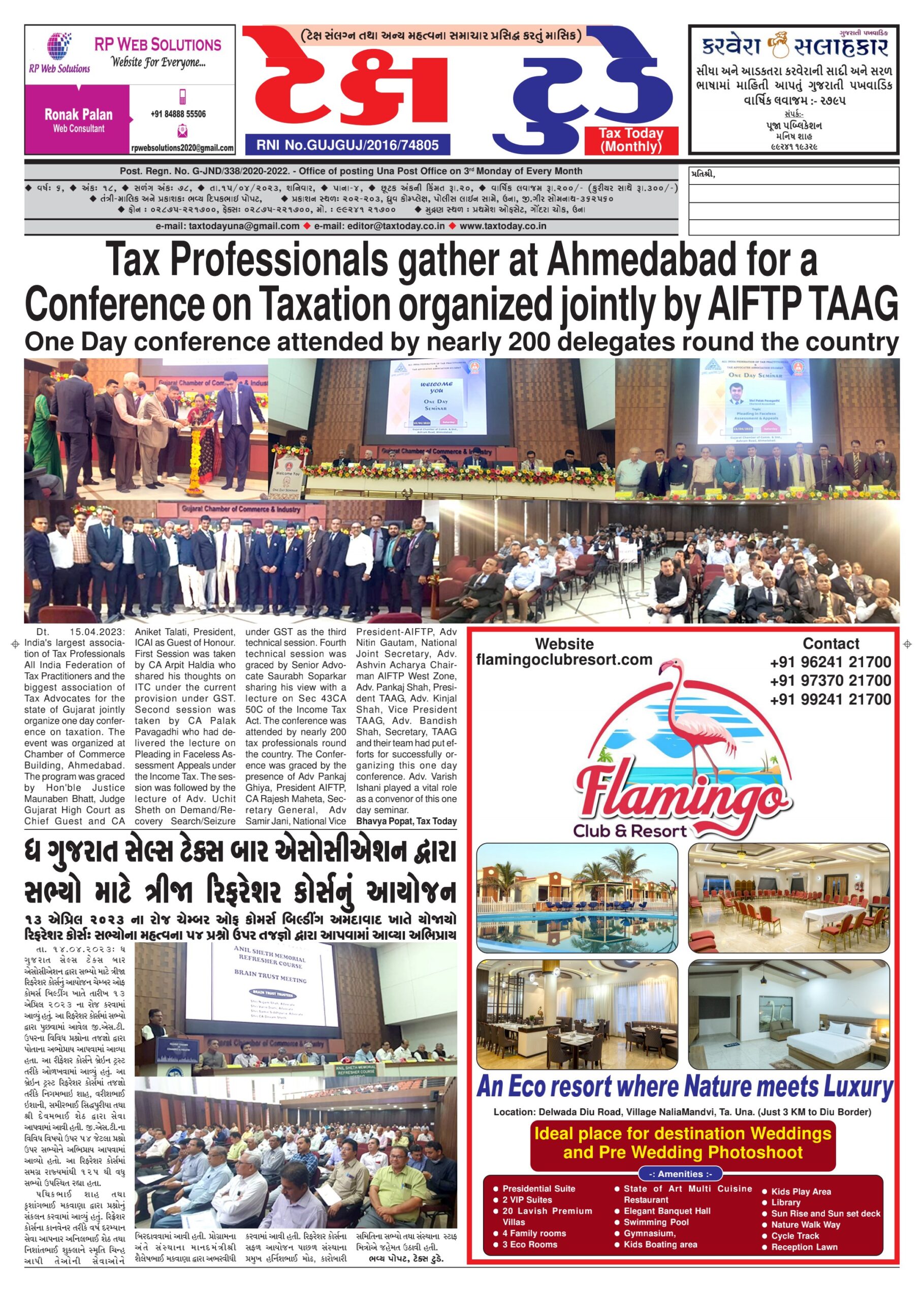 E Edition Top News Tax Today April 2023 Bhavya Popat April 22, 2023 Spread the loveReading Time: < 1 minute Tags: E Edition, Tax Today Continue Reading Previous જી.એસ.ટી. હેઠળ એપ્રિલ મહિનામાં આ કર્યો કરવાનું ચૂકશો નહીં!!Next સવાલ આપના જવાબ ટેક્સ ટુડે એક્સપર્ટના (આ કૉલમ દર શનિવારે પ્રસિદ્ધ થશે) 22nd April 2023 More Stories Top News ગુજરાત હાઈકોર્ટનો મહત્વપૂર્ણ ચુકાદો: ટ્રાન્ઝિટ દરમિયાન GST હેઠળ માલ જપ્તી અંગે કડક માપદંડ નક્કી Guest Writer (Article from Expert) January 6, 2026 0 Top News GST WEEKLY UPDATE :40/2025-26 (04.01.2026) Guest Writer (Article from Expert) January 5, 2026 0 Top News ભાગીદારી પેઢીઓ માટે મહત્વનો ફેરફાર: ભાગીદારોને થતી ચુકવણી પર TDS ફરજિયાત Guest Writer (Article from Expert) January 5, 2026 0