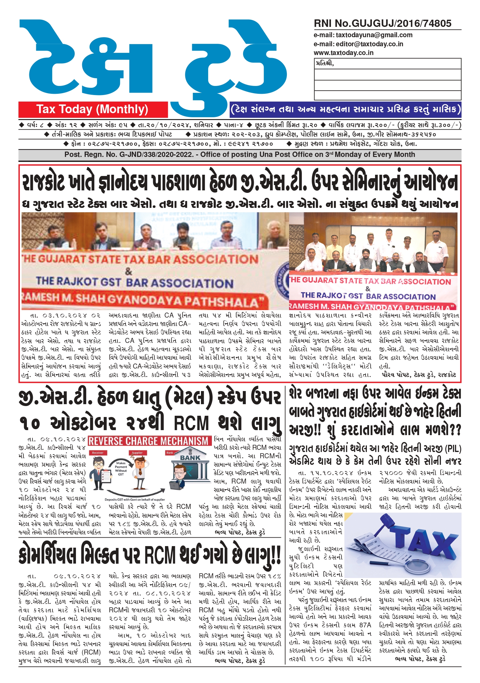 Top News Tax Today October 2024 Bhavya Popat November 30, 2024 Spread the loveReading Time: < 1 minute Tax Today October 2024: To read in PDF please click below Tax Today-October-2024 Continue Reading Previous બાર કાઉન્સિલ ઓફ ગુજરાત દ્વારા નોટરી સી.ઓ.પી માટે રજુઆતNext Tax Today November 2024 E Edition More Stories Top News GST WEEKLY UPDATE :51/2025-26 (22.03.2026) By CA Vipul Khandhar Guest Writer (Article from Expert) March 23, 2026 0 Top News GST અંતર્ગત બુક્સ ઓફ એકાઉન્ટ ક્લોજ કરતી વખતે ધ્યાન માં રાખવાના મુદ્દાઓની સરળ ભાષામાં સમજુતી Guest Writer (Article from Expert) March 23, 2026 0 Top News વેપારીના વિશ્વાસનો ફાયદો ઉઠાવી એકાઉન્ટન્ટ દ્વારા ખોટા બિલો બનાવવા અંગે નોંધાઈ ફરિયાદ Guest Writer (Article from Expert) March 22, 2026 0