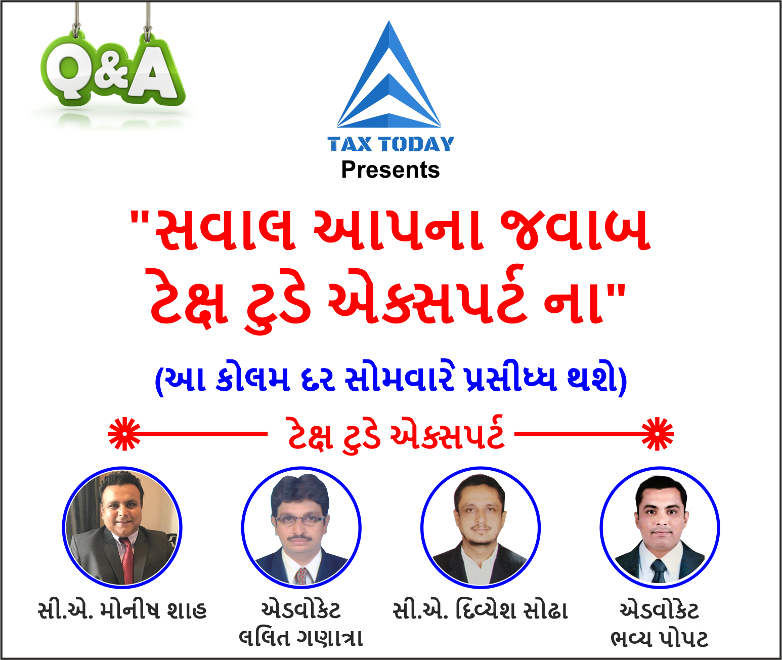 - અમારા એક્સપર્ટ ટેક્સ ટુડે ને આ સેવા વાચકો ના લાભાર્થે આપે છે. તમામ વાચકો ને વિનંતી કે પોતાના પ્રશ્નો ટેક્સ ટુડે ને નીચે આપેલ ઇ મેઈલ પર મોકલે. કોઈ પણ સંજોગો માં વાચકો ને વિનંતી કે એક્સપર્ટ્સ નો સીધો સંપર્ક બિનવ્યવસાયી રીતે ના કરવો.